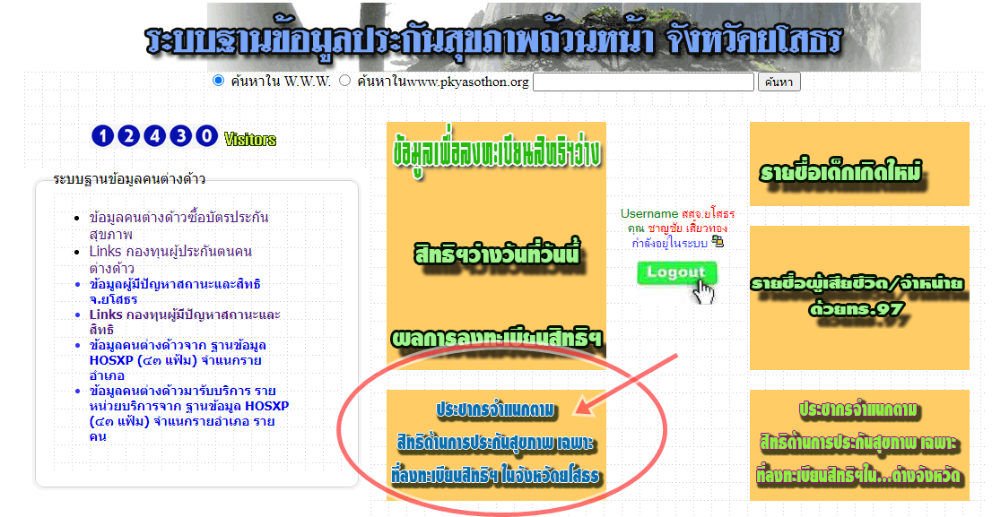 หน้าตัวอย่าง เข้าดูฐานข้อมูลประชากรDBPOP ยโสธร สิทธิในระบบหลักประกันสุขภาพ