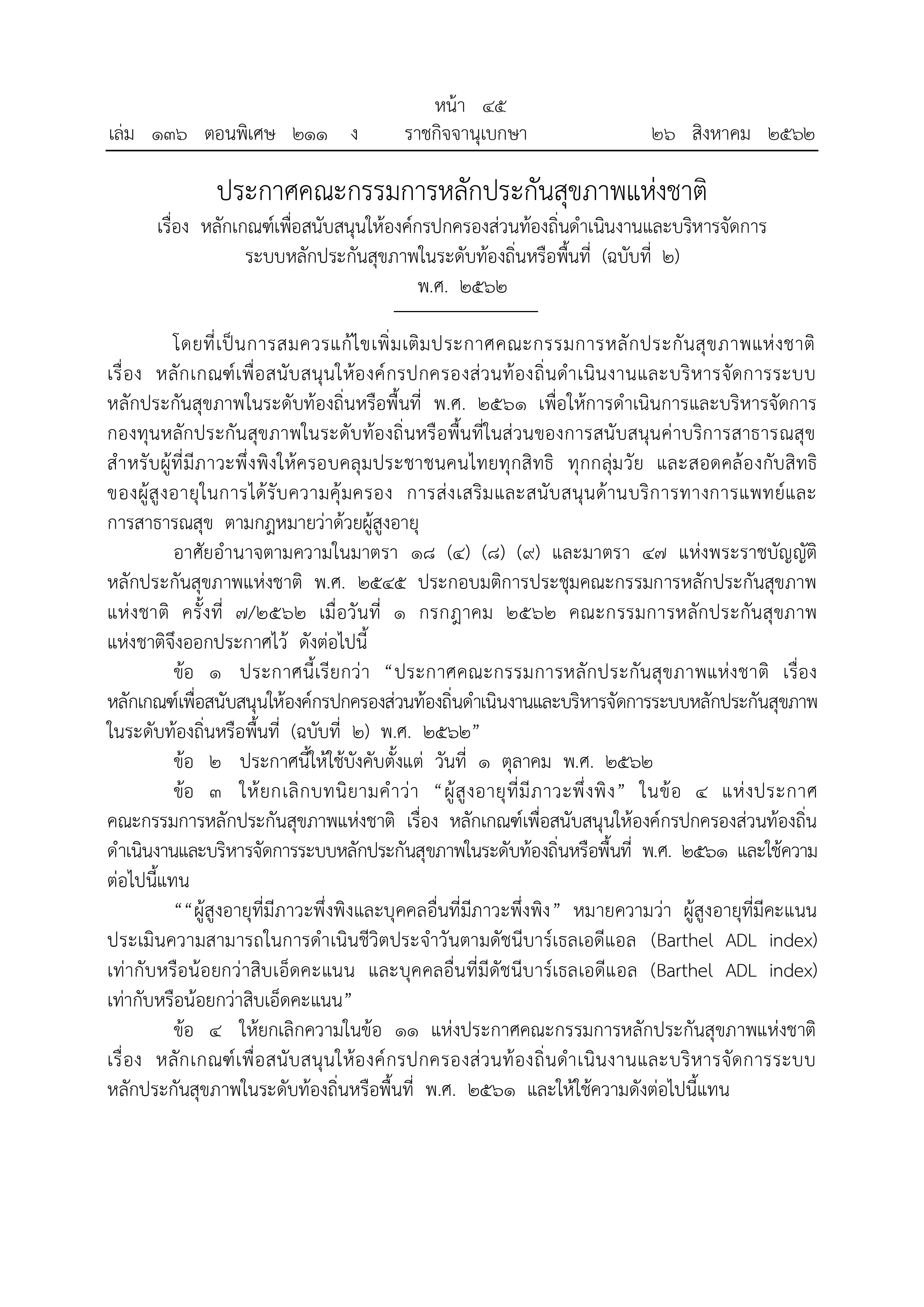 ประกาศคณะกรรมการหลักประกันสุขภาพแห่งชาติ เรื่องเหลักเกณฑ์เพื่อสนับสนุนให้องค์กรปกครองส่วนท้องถิ่นดำเนินงานและบริหารจัดการระบบหลักประกันสุขภาพในระดับท้องถิ่นหรือพื้นที่